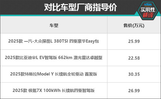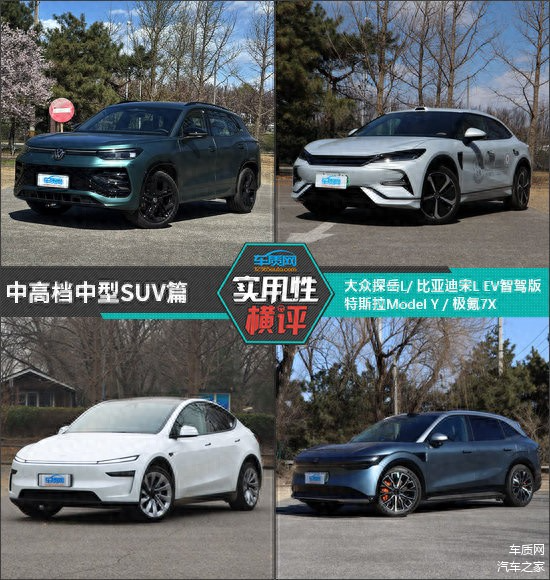 随着车价逐步下探,中型SUV已经成为很多普通家庭的首选车型。相比低级别车型,中型SUV可以更好满足消费者的多方面需求,且日常用车成本也不会很高。在往期的“日常实用性测试”中,我们曾测试过不少中高档中型SUV,此次就将一汽-大众探岳L、比亚迪宋L EV智驾版、特斯拉Model Y和极氪7X汇集到一起,通过测试成绩的横向对比,来看看哪款车型日常实用性表现更为全面。