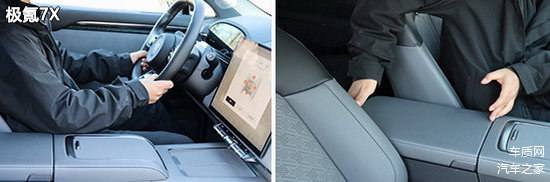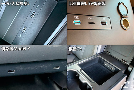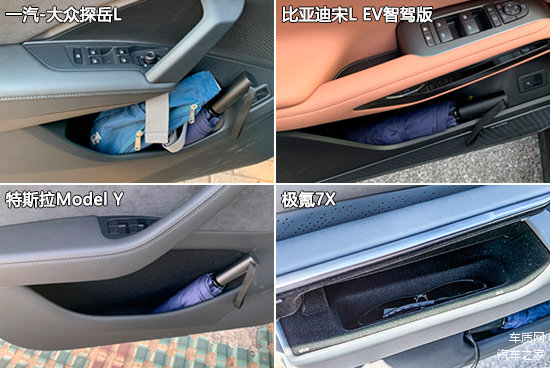 前排中央扶手方面,极氪7X采用侧开式设计,一汽-大众探岳L、比亚迪宋L EV智驾版、特斯拉Model Y采用上掀式设计。此外,除一汽-大众探岳L外,另外三款车型的中央扶手均不支持前后移动或角度调节,但得益于扶手面积较大,依然能够为驾驶者提供有效支撑。