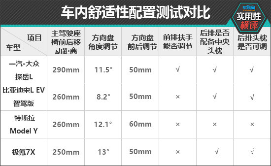 主驾驶座椅前后移动距离方面,一汽-大众探岳L表现最为出众,测试数值达到290mm,可以更好适应不同身材的驾驶者;极氪7X在这一环节表现不佳,仅为250mm。方向盘调节方面,极氪7X上下调节角度最为出色,测试成绩好于其他三款车型;前后调节距离表现最佳的是特斯拉Model Y,为60mm。