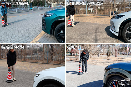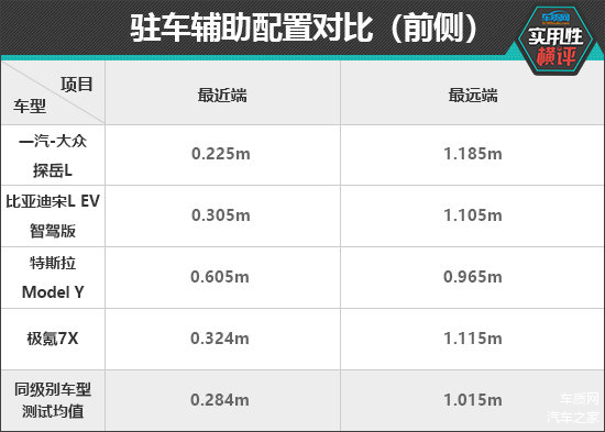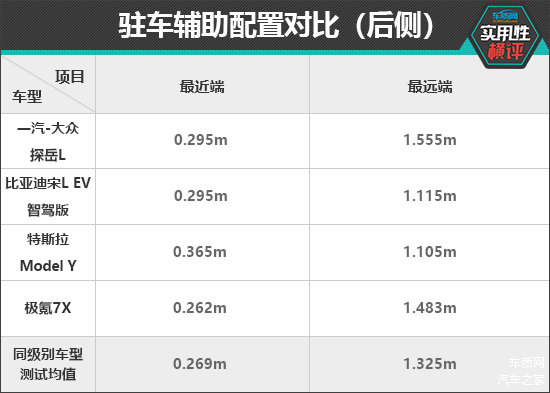 在前驻车雷达测试中,根据已有测试数据来看,一汽-大众探岳L、比亚迪宋L EV智驾版和极氪7X的最远探测距离均超过了同级别车型测试均值,雷达功率表现相对较好。最近提示距离方面,比亚迪宋L EV智驾版的表现要好于其他三款车型,测试成绩与同级别车型测试均值更接近。