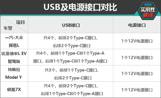 充电接口方面,特斯拉Model Y不仅在接口数量方面少于另外三款车型,还仅提供Type-C一种类型接口,兼容性一般。相比之下,比亚迪宋L EV智驾版表现最优,前后排均提供两种类型接口,对于充电设备的兼容性更好。此外,四款车型均配备了1个12V电源接口。