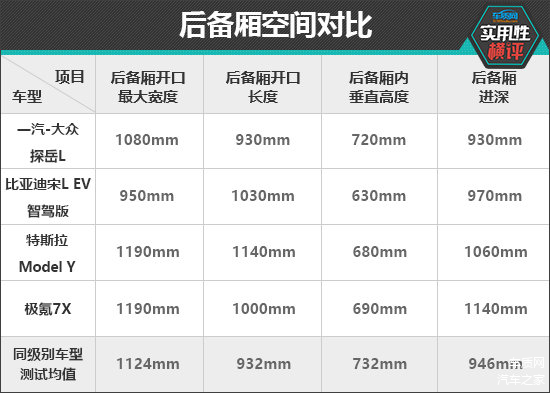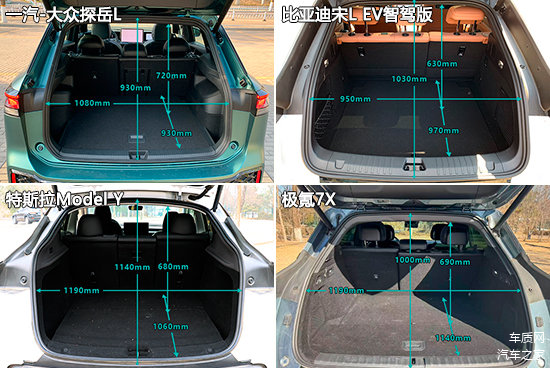 后备厢方面,四款车型的后备厢地台都比较平整,且后排座椅还支持比例放倒,可以进一步扩充储物空间。对于四款车型的后备厢实际载物能力,我们进行了测量,极氪7X和特斯拉Model Y都有三项测试数据超过同级别车型测试均值,综合表现不错,一汽-大众探岳L表现一般,四项测试数据均未达到同级别车型测试均值。