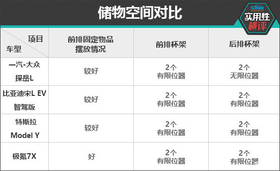 本期参与对比的四款中高档中型SUV在实用性方面均交出了令人满意的答卷,基本可以满足日常使用需求。不过,从具体测试环节来看,四款车型也都存在值得优化的地方。其中,一汽-大众探岳L在后备厢空间方面表现一般,四项测试数据均未达到同级别车型测试均值;比亚迪宋L EV智驾版在方向盘调节角度方面相比另外三款车型有一定差距;特斯拉Model Y在后方视野盲区和左右外后视镜视野范围角度方面,都需要进一步优化;极氪7X则是在主驾驶座椅前后移动距离方面还有提升空间。综合来看,四款车型的实用性表现均未有明显硬伤,消费者可以按需进行选择。