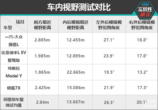 在后方视野测试中,比亚迪宋L EV智驾版和一汽-大众探岳L测试成绩相对更好,数据层面达到同级别中上游水平。相比之下,特斯拉Model Y测试成绩垫底,后方视野盲区偏大。