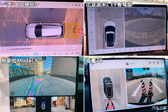 在影像辅助系统方面,四款车均配备360度全景影像系统,整体画质清晰;同时,比亚迪宋L EV智驾版和极氪7X还带有透明底盘功能,更方便驾驶员查看车辆周边情况。
