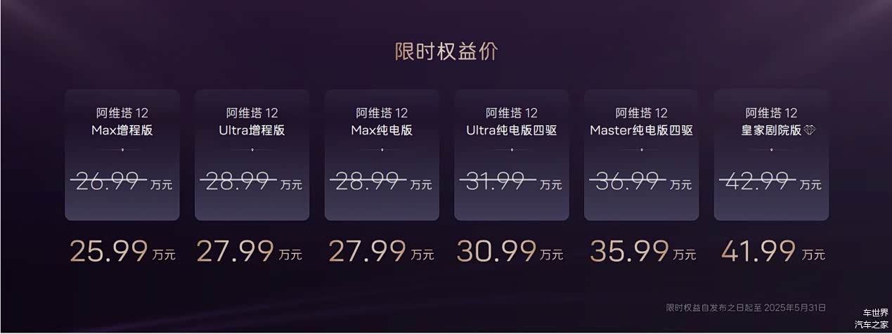 阿维塔12 2025款官方指导价26.99-42.99万元,全系车型还可享受1万元现金权益,权益后到手价25.99-41.99万元,以及至高4万元的配置权益。全系可享价值2万元的ADS高阶功能包等额抵扣券;Ultra纯电版四驱、Ultra增程版、Max纯电版和Max增程版车型,可享价值1万元的英国之宝·卓悦之声音响系统(25扬声器)和价值8千元的21英寸光束多辐运动轮毂配置权益;Master纯电版四驱可享受至高1万元的内外饰升级选装折扣及价值1万元的智能光感变色天幕。