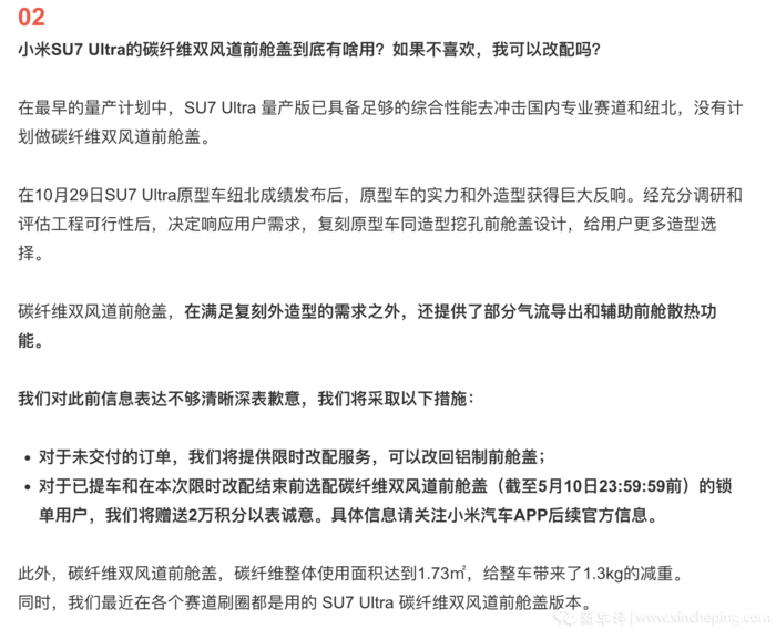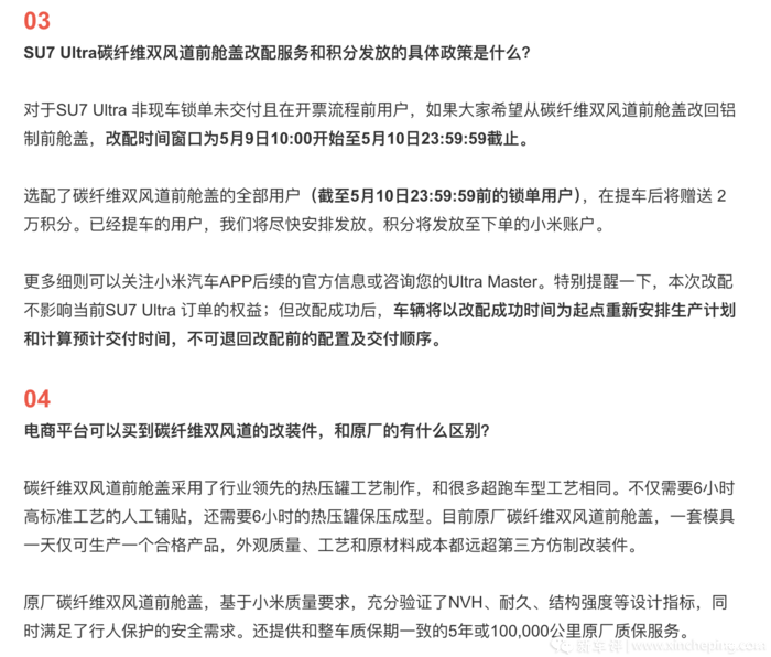 针对用户对此配置的不同需求,小米汽车宣布了两项补偿措施:对于未交付的SU7 Ultra非现车锁单且在开票流程前的用户,如希望从碳纤维双风道前舱盖改回铝制前舱盖,可在5月9日10:00至5月10日23:59:59期间申请改配;对于截至5月10日23:59:59前所有选配了碳纤维双风道前舱盖的锁单用户,小米将在提车后赠送2万积分作为补偿,已提车用户的积分将尽快安排发放至下单的小米账户。