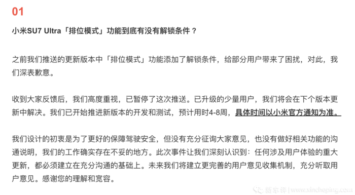 官方解释,设置解锁条件的初衷是为了更好地保障驾驶安全,但承认在实施前没有充分征询用户意见,也未做好相关功能的沟通说明。小米汽车表示:"此次事件让我们深刻认识到:任何涉及用户体验的重大更新,都必须建立在充分沟通的基础上。未来我们将建立更完善的用户意见收集机制,充分听取用户意见。"