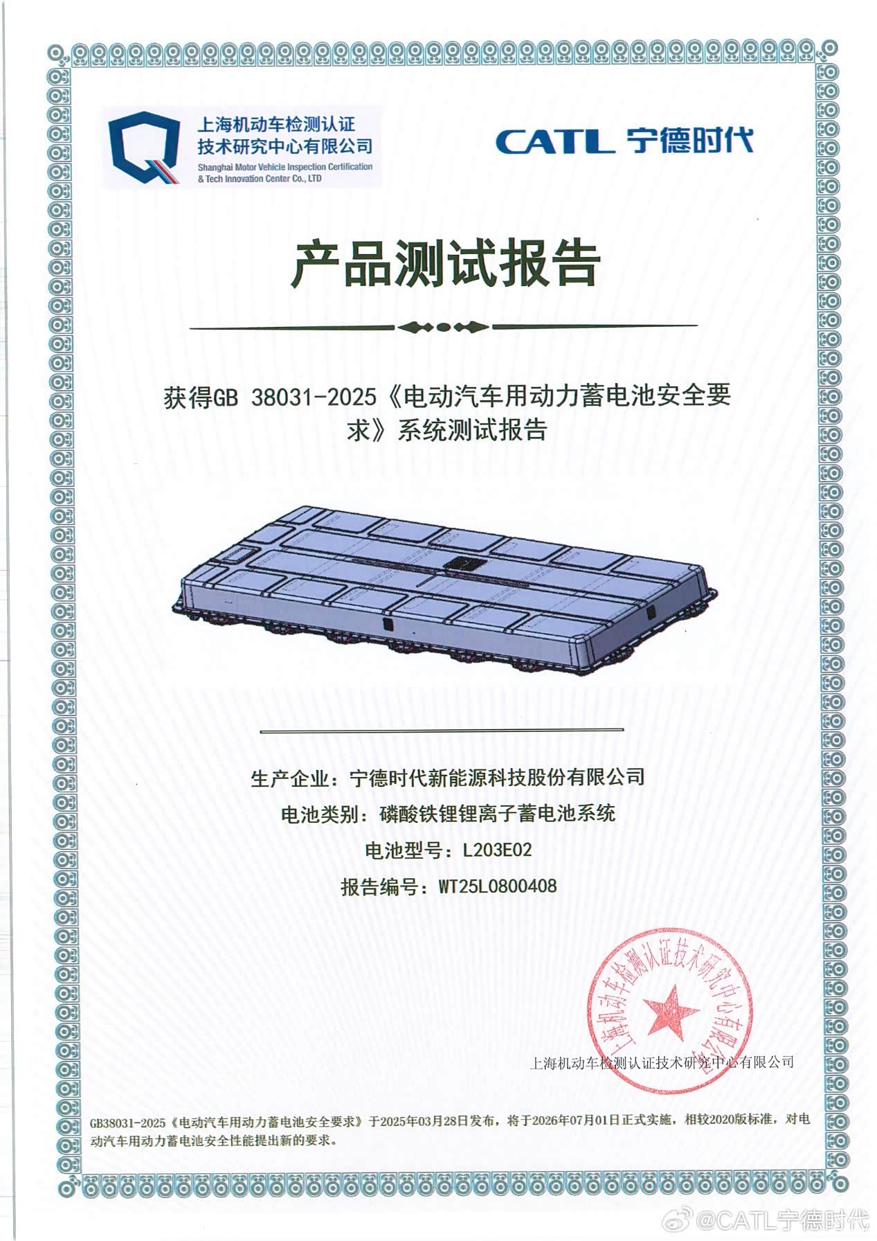 5月7日,宁德时代天行B-客车系列、天行H-重型商用车系列与天行L-轻型商用车系列电池包分别在招商车研、中国汽研、上海机动车检测中心等权威第三方检测机构通过GB38031-2025《电动汽车用动力蓄电池安全要求》(以下简称“新国标”)检测。据了解,这是继4月27日宁德时代电池类产品获得两张GB 38031-2025《电动汽车用动力蓄电池安全要求》检测报告后,再次获认证通过。
