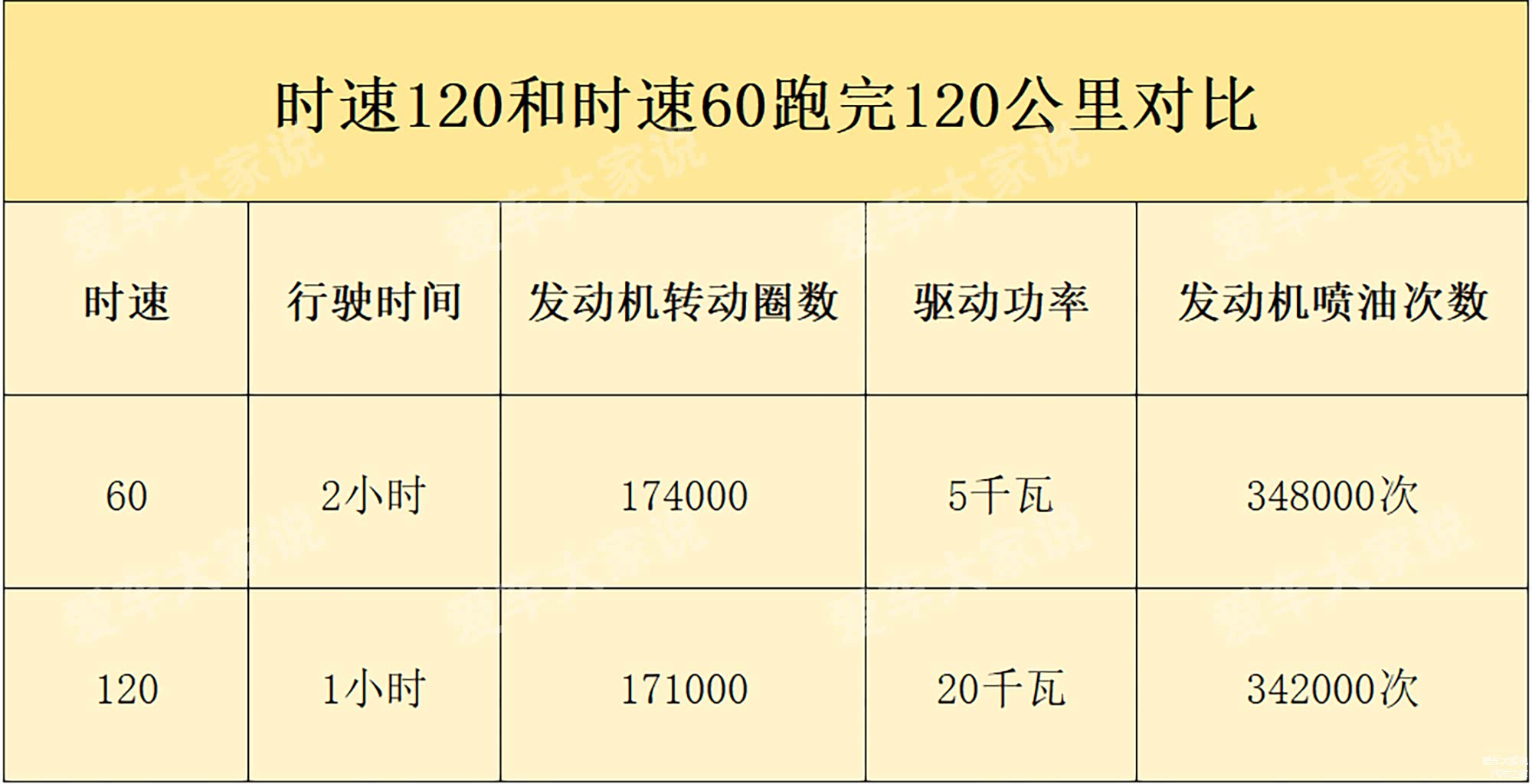 这么一对比就特别直观啦:虽说时速 120 跑完全程能少用 1 个小时,可车速高发动机转速也高呀,算下来跑完全程发动机也就少转了 3000 圈。3000 圈是个啥概念呢,也就相当于怠速 3 分多钟罢了。