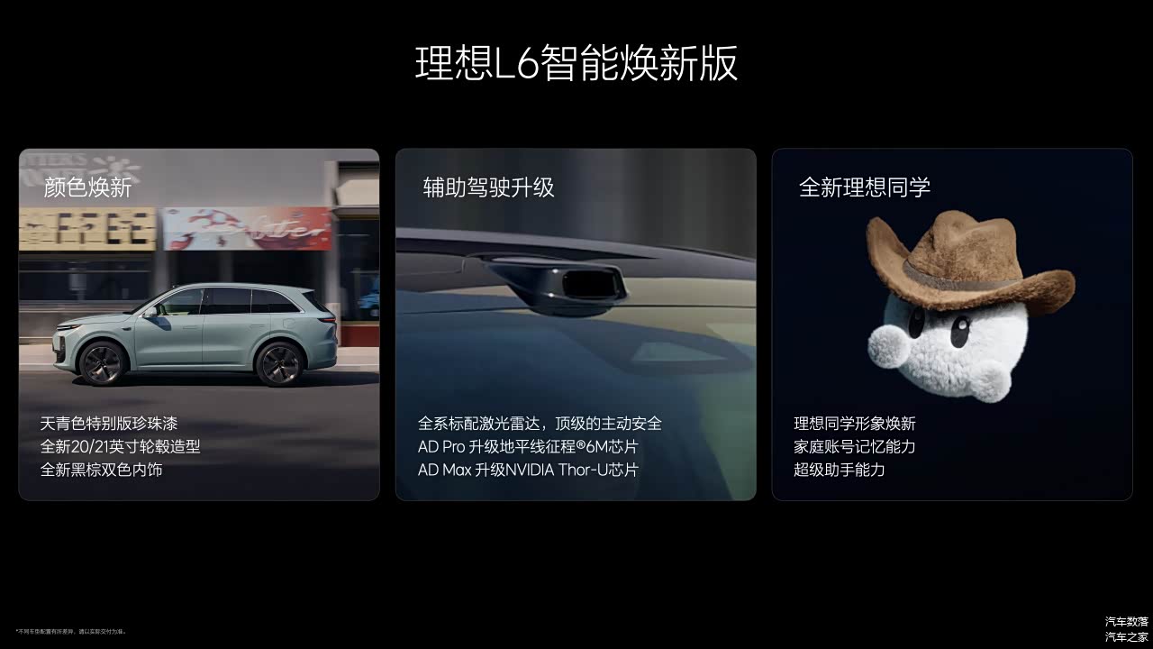 5月8日,理想L系列智能焕新版正式发布。本就以智能见长的理想L系列,通过辅助驾驶芯片的升级、全系标配激光雷达等举措,更加强化其智能属性,价格则保持不变。 理想L6(图片 | 参数 | 询价)智能焕新版24.98万-27.98万元,理想L7智能焕新版30.18万-35.98万元,理想L8智能焕新版32.18万-37.98万元,理想L9智能焕新版40.98万-43.98万元。
