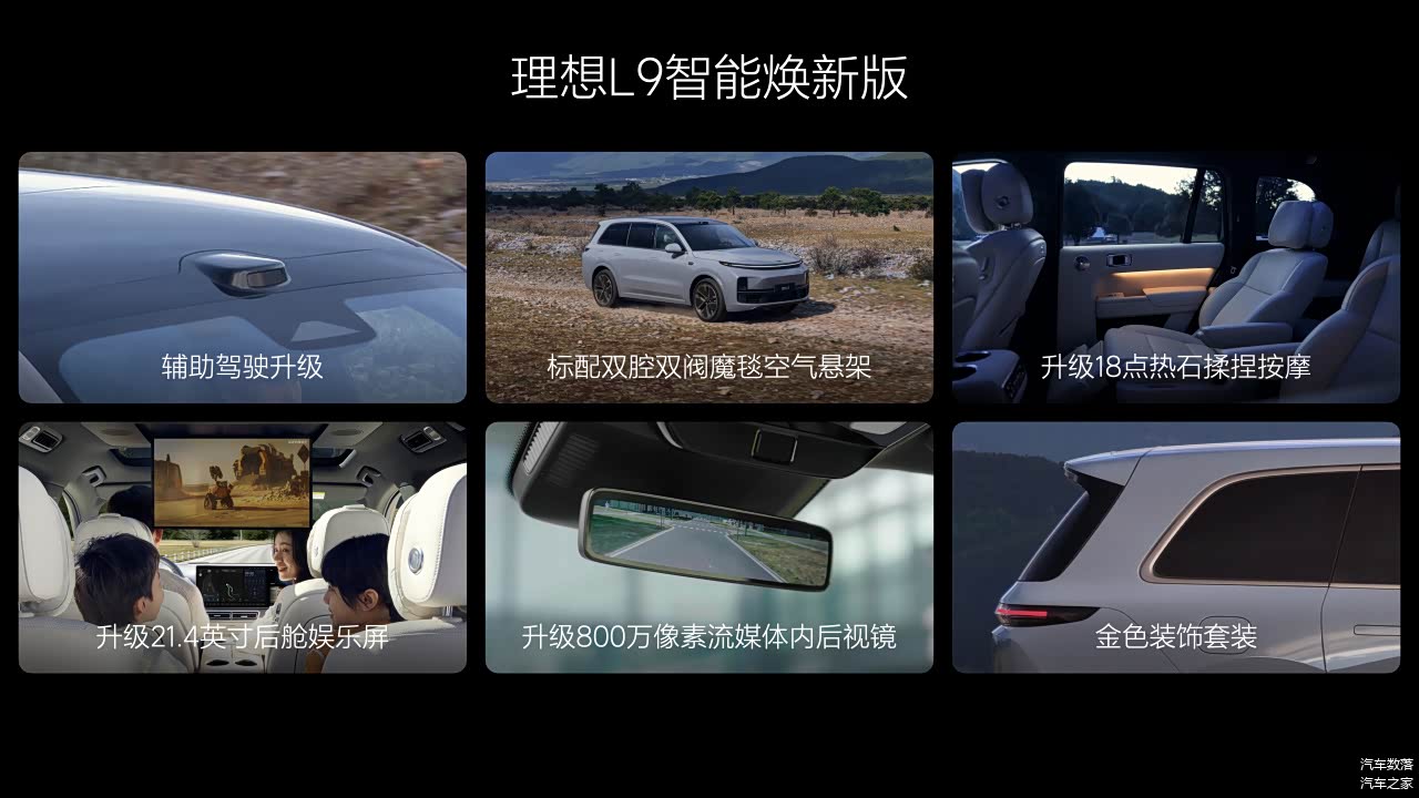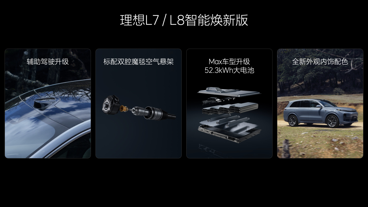 除智能升级外,新车还在外观造型、底盘等方面的产品力进行了增加,包括理想L6智能焕新版新增天青色外观颜色,理想L7和L8智能焕新版新增蓝灰外观颜色,理想L9智能焕新版新增雅灰外观颜色,理想L系列智能焕新版全系新增全新黑棕双色内饰,以及全新设计的20英寸、21英寸轮毂;理想L7和L8智能焕新版新增双腔魔毯空气悬架;理想L9智能焕新版新增双腔双阀魔毯空气悬架、18点热石揉捏按摩、21.4寸家庭影院、800万超清流媒体内后视镜等。