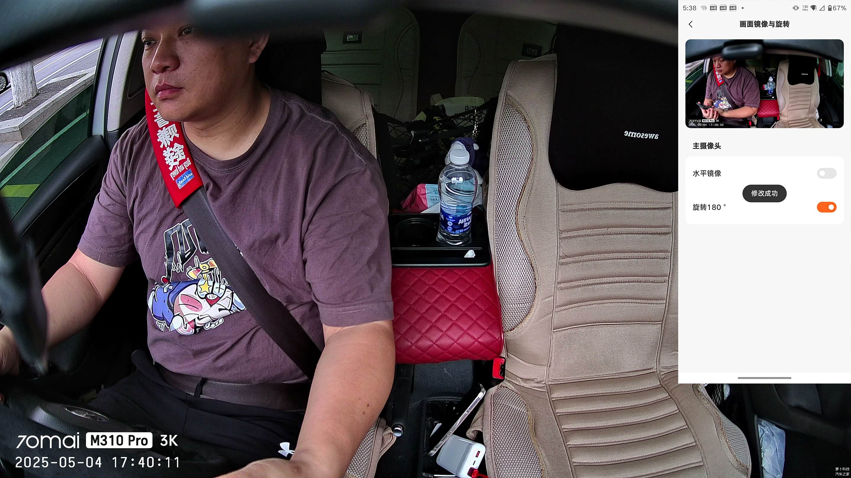 70 迈M310 Pro小巧的机身支持360°旋转,无论是前档玻璃还是后档玻璃均可安装,车内、车外拍摄也没有问题。同时支持视频翻转&镜像(APP内设置),无需担心画面颠倒。