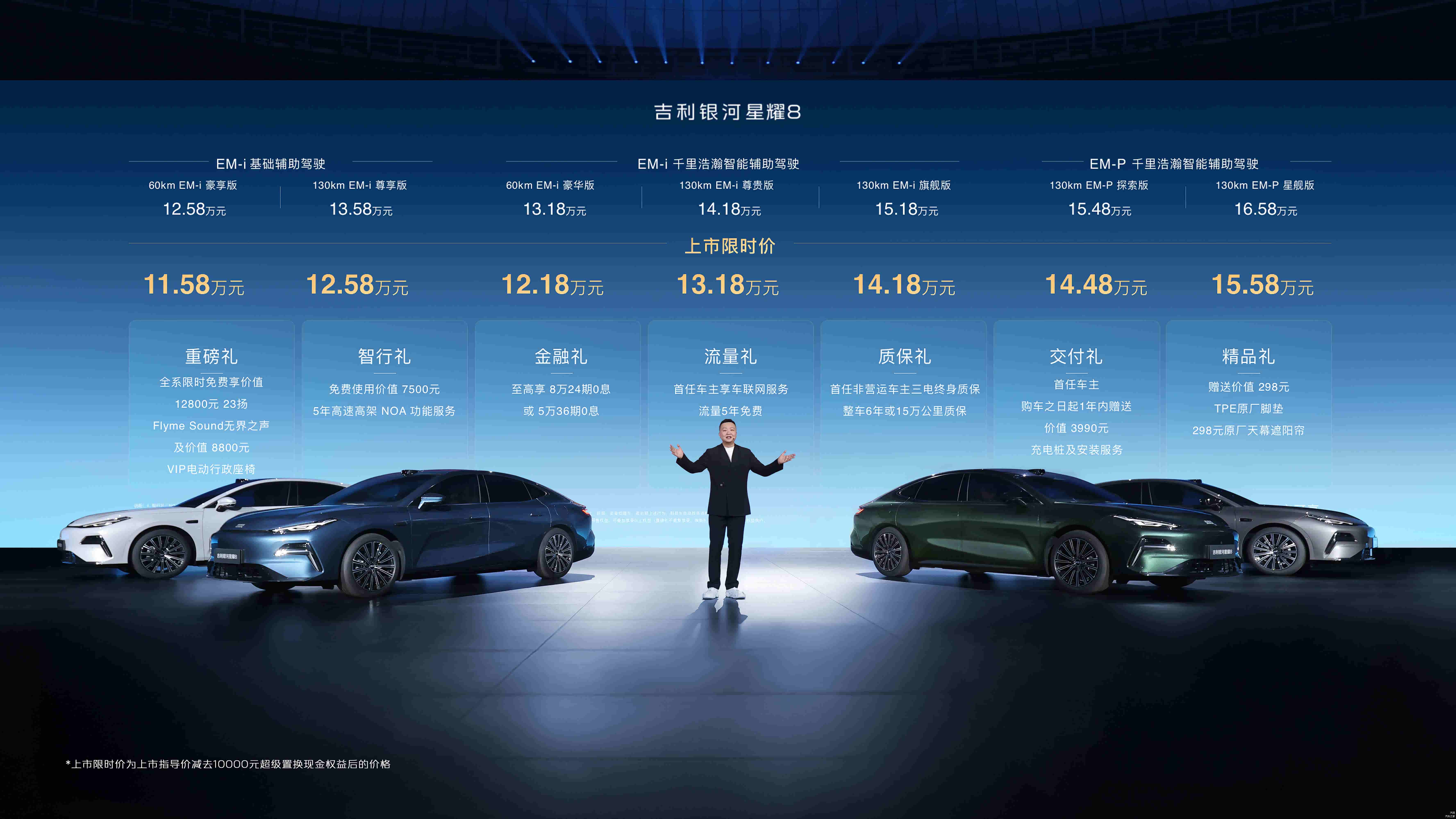 2024年5月9日,吉利汽车旗下 银河星耀8(图片 | 参数 | 询价)豪华电混轿车正式上市,新车共推出4款配置车型,官方指导价12.58万-16.58万元,并推出限时优惠政策:6月30日前下定可享11.58万元起的惊喜价,同时免费升级23扬声器Flyme Sound音响系统和VIP行政座椅套装(价值1.5万元)。