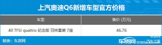 5月10日,车质网从相关渠道获悉,上汽奥迪Q6新增加quattro纪念版车型,售价为46.76万元,限时优惠价36.5万元。新车标配羽林套装,并采用7座布局,动力上搭载2.0T发动机。