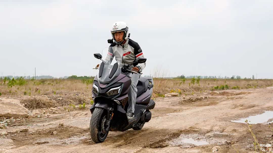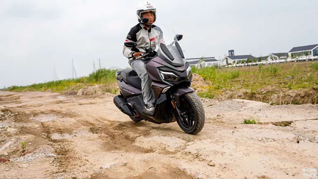 在破碎土石路上,我们继续体验这辆300排量平踏板的非铺装路性能,先说结论,比一般大踏板要好,可以打75分。首先避震器的设定在兼顾舒适性的同时富有韧性,在35km/h左右的速度经过明显的坑洼,减震支撑足够,回弹及时,短轴距设计也让车辆过颠簸路时更整无松散感。在连续的坑洼路面,以50左右速度通过较深的坑洼,会出现避震触底的状态,车把的起伏感较大。究其原因,毕竟这是台186kg的大踏板,加上驾驶者75kg,较大的自重对避震器的支撑性还是非常考验的,好在原厂前15后14的轮圈和145mm的离地间隙,即使极限状态下,也不会拖底盘,应对一般的旅行路况足够,表现符合多面手的定位。