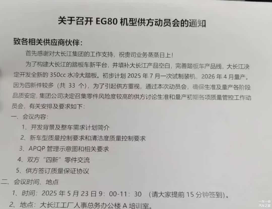 传了三年的豪爵大踏板终于有消息了。最近一张《关于召开EG80机型供方动员会的通知》在网上传的沸沸扬扬,其中提到“大长江决定开发全新的350cc水冷大踏板,初步计划2025年7月一次试装制机,2026年4月量产。”这意味着,豪爵的350踏板最快明年4月就能上市,销量最高的国产摩托车企业终于有大踏板了。