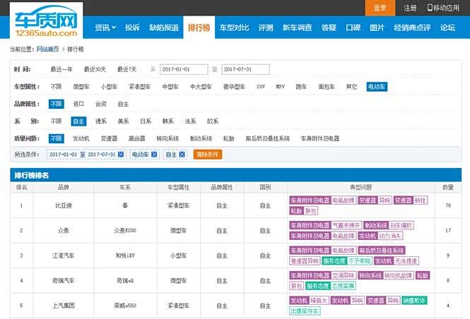 在车质网的的投诉中,我们通过查询2017年1-7月自主品牌电动车投诉排行榜,发现比亚迪秦的投诉量占据第一位,为78条,占比高达54%,而上汽仅为4辆,占比仅为3%。对于一款车来说,质量问题都不能保证,还怎么让消费者信服。