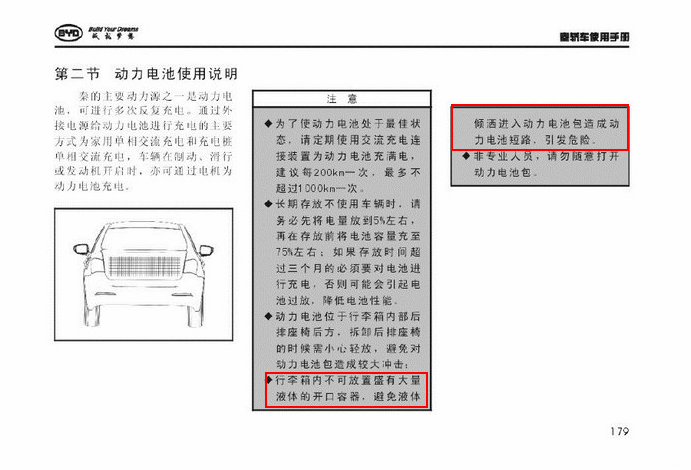 相比之下,比亚迪似乎就没有这种自信。举个例子,比亚迪在秦的用户手册上就“赤裸裸”的写着:行李箱内不可放置盛有大量液体的开口容器,避免液体倾洒进入动力电池包造成动力电池短路,引发危险。