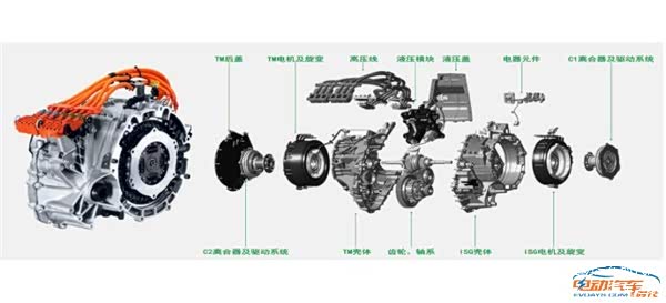 连接ISG电机与发动机的离合器C1采用了常开的设定,而连接TM电机的离合器C2则采用了常闭的设定,可以看出,这套混动系统以电为主,油为辅,只在低电量以及需要大扭矩输出时,发动机才会介入。此外,发动机、电机和变速箱采用同轴设计,无偏心惯量,所以这套动力系统不仅仅低油耗,节能环保,还有强于同级别燃油车的性能,还能给驾驶者带来更舒适,更平顺的驾驶感受。
