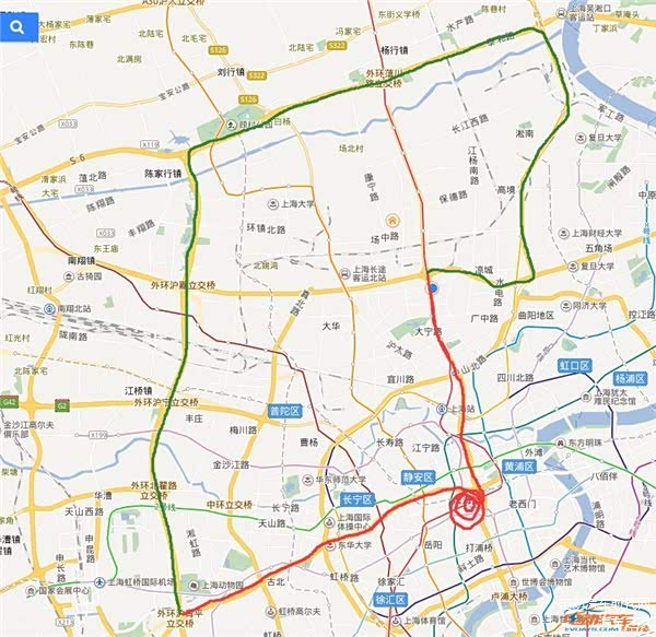 这个路线模拟的是综合路况,红色的为城市路况,有城市地面道路和城市高架路,我们从中环汶水路附近的加油站出发,走地面道路到了上海浦西的繁华地段淮海路商圈,在淮海路附近兜了几圈,这段路程平均速递不超过15km/h,绝对的拥堵路段。之后在淮海路附近上延安高架,工作日中午的延安高架一点也不顺畅,之后我们就到了路线图中的绿色路段,外环高速。