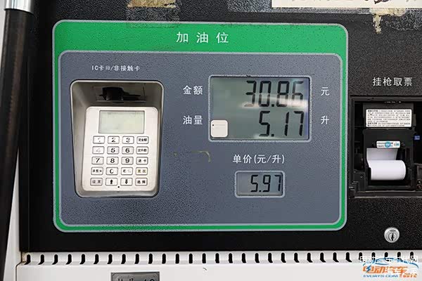 用与出发前加油时相同的加油枪,同样加油至跳枪,加油量为5.17升。所以,通过计算可知百公里油耗约为6.8升,不知道怎么计算的可以去复习一下小学数学了。