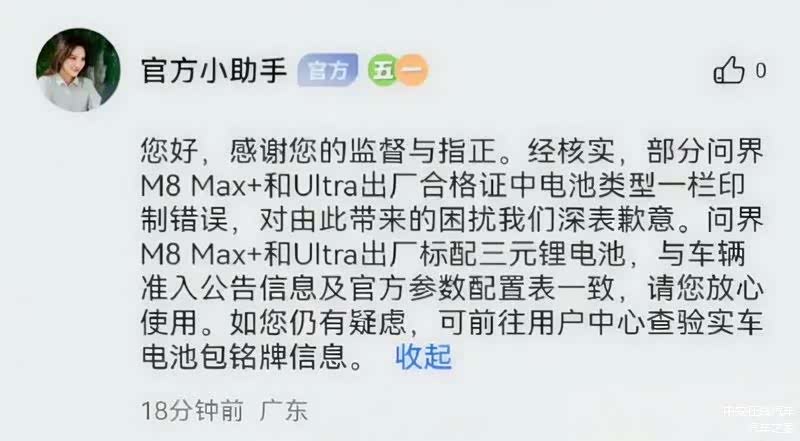 对此,鸿蒙智行APP上官方小助手在社区回应称:“经核实,部分问界M8 Max+和Ultra出厂合格证中电池类型一栏印制错误,对由此带来的困扰我们深表歉意。”同时,问界汽车官方小助手指出:“问界M8 Max+和Ultra出厂标配三元锂电池,与车辆准入公告信息及官方参数配置表一致。