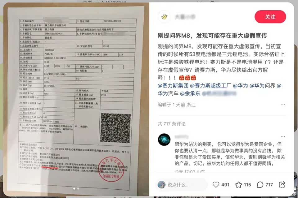 据媒体报道,日前,多位问界车主在鸿蒙智行APP上反馈:表示自己购买的问界M8 Max+版本车型的车辆合格证上,电池类型为磷酸铁锂电池,而不是宣传的三元锂电池,这令不少车主感到非常疑惑,质疑问界“虚假宣传”,随后这一话题在网上引发大量关注。