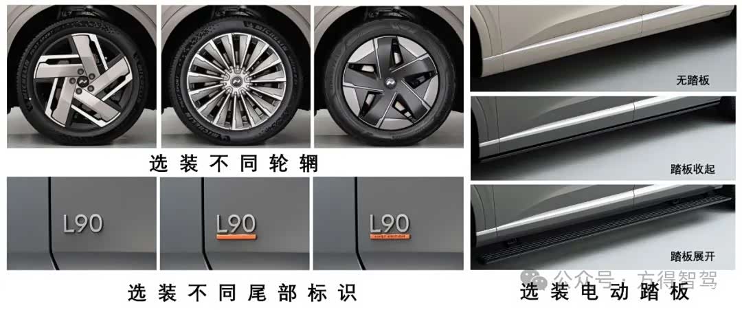该车型可选装ETC车载装置,配备汽车事件数据记录系统(EDR)。另外,该车型可选装不同轮辋,不同尾部标识,电动踏板。从选装图片可看出,这款乐道L90可选择的有三款轮毂、两款尾部标识。