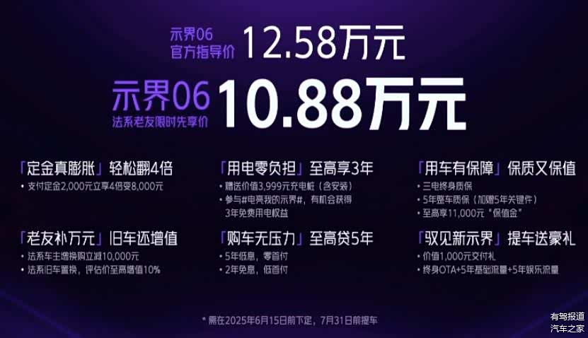 5月20日,神龙集团全新品牌HEDMOS 示界06(图片 | 参数 | 询价)正式上市,新车共推出1款,售价为12.58万元,限时先享价10.88万元。与此同时,官方还推出了多项权益,在2025年6月15日前完成下定并在7月31日前提车,即可享受相关权益。