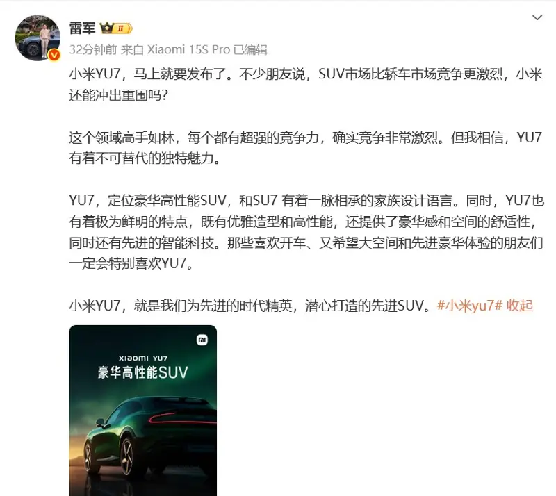 5月21日,小米汽车创始人雷军借助社交媒体平台,正式揭开了小米YU7车型宝石绿配色官图的神秘面纱,为即将到来的新车发布提前预热。据悉,这款备受瞩目的新车将于5月22日晚间正式与消费者见面,目前预约咨询通道已全面开启,引发了众多车迷和消费者的关注。