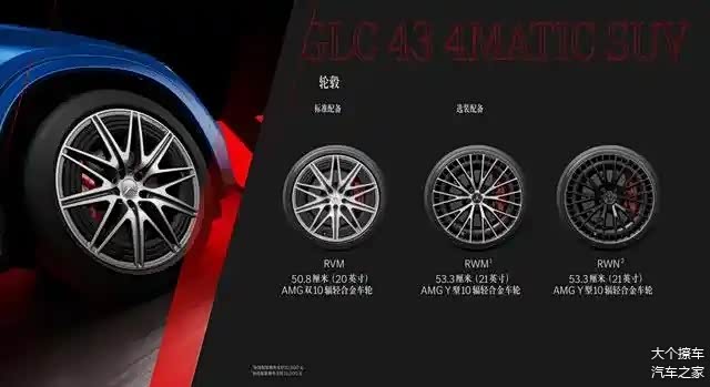 此外,2025款的奔驰GLC AMG 43 4MATIC还提供了21英寸AMG Y型10辐亮面轻合金轮毂和21英寸AMG Y型10辐熏黑轻合金轮毂的选配选项。