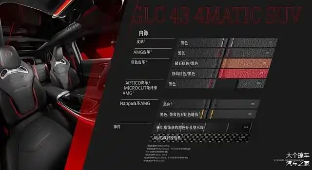 此外,2025款奔驰GLC AMG 43 4MATIC还为用户提供了7种不同的内饰配色和缝线选项,包括黑色内饰与白色缝线、AMG黑色皮革与红色缝线、赭石棕色与黑色匹配与黑/棕缝线、赭石棕色与黑色皮革与黑/红缝线、黑色ARTICO皮革与MICROCUT微纤维AMG与红色缝线、黑色Nappa皮革AMG与黑色缝线以及黑色Nappa皮革AMG与黄色缝线;两种不同的内部装饰元素包括:一种是嵌有铝质饰条的黑色开孔型木饰,另一种是AMG碳纤维饰件。