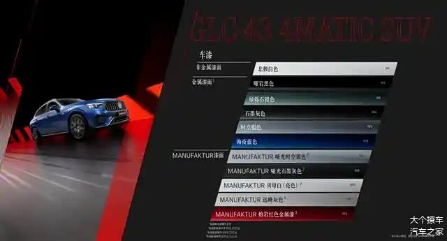 在车漆的颜色选择上,2025款奔驰GLC AMG 43 4MATIC为用户提供了6种标准车漆和5种MANUFAKTUR选装车漆: