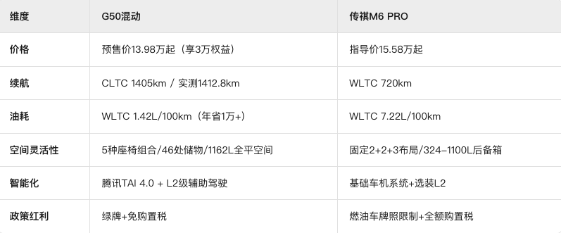 作为全球唯一10万级混动MPV,上汽大通G50混动搭载1.5L混动专用发动机,加P1+P3双电机组成的插电混动系统,CLTC综合续航1405km,实测海南环岛续航达1412.8km,彻底终结MPV长途焦虑。其WLTC综合油耗仅1.42L/100km,CLTC馈电油耗5.4L/100km,对比传祺M6 PRO的7.22L/100km,年均油费节省超1万元。若按年行驶2万公里计算,5年油费差额可覆盖购车差价。