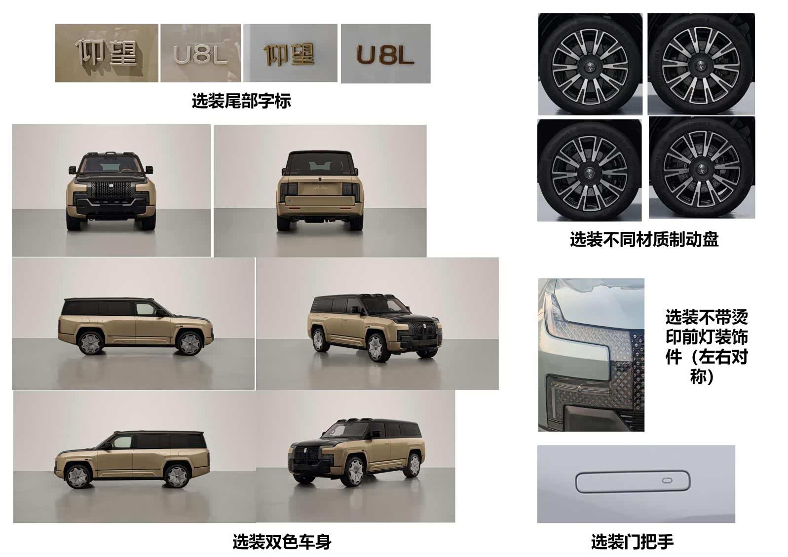 答答点评:仰望U8是国内首款价格超百万的量产SUV,在中国汽车史上留下浓墨重彩的一笔。仰望U8同时具备豪华、科技、性能等多重属性,“易四方”技术可提供17种驾驶模式,具备原地掉头、蟹行模式、浮水模式等特殊功能。自2024年4月开启预订,仰望U8的总订单数已突破3万辆,目前的月销量维持在几百辆,超越大部分百万级豪车的月销量。仰望U8L不仅轴距更长,豪华属性也更突出,金色装饰件的数量更多,车标还是纯金材质,售价方面也会超越现款。