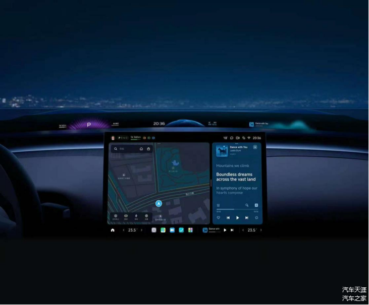 关注度较高的天际屏全景显示,其实简单来说由三块小LED屏幕将信息反射到前风挡下黑区,将主驾显示、副驾娱乐屏、车辆详细信息囊括在一起。