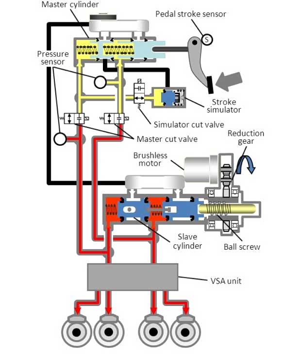 其中刹车踏板连接踏板行程传感器与带切断阀的刹车主缸Main Cylinder及行程模拟器液压回路(黄色)相连。而电控单元控制直流无刷电机通过减速齿轮和滚珠丝杠结构控制刹车从缸Slave Cylinder及VSA刹车电子稳定系统相连的液压回路(红色)。由压力传感器的反馈,决定主缸与从缸液压回路切断和联通,从而对整个电液刹车系统进行刹车力矩分配。