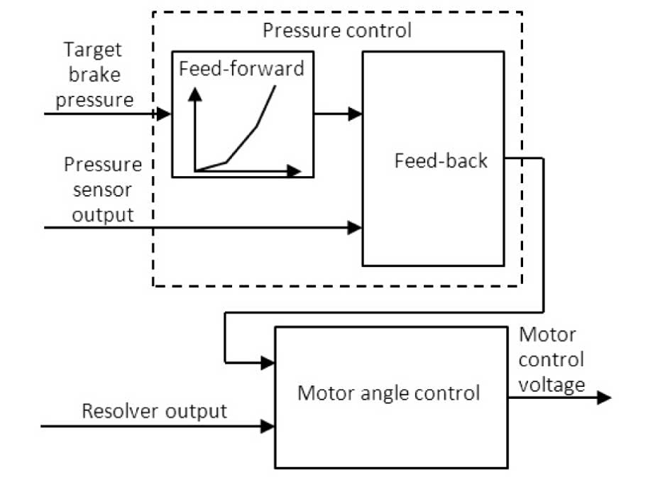具体刹车力矩的分配由伺服电液刹车系统刹车压力控制实现。其逻辑关系为目标刹车压力需求将送入压力控制单元,经过前馈控制Feed-forward输出。然后由反馈控制Feed-back模块结合压力传感器的输出信号Pressure sensor output给出控制目标。然后交由电机角度控制单元Motor angle control结合电机位置传感器输出信号Resolver output给出电机控制电压信号控制电机旋转。