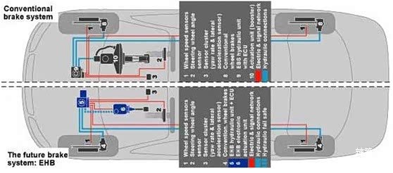 ↑传统刹车系统和电液刹车系统EHB对比示意图(来自网络)