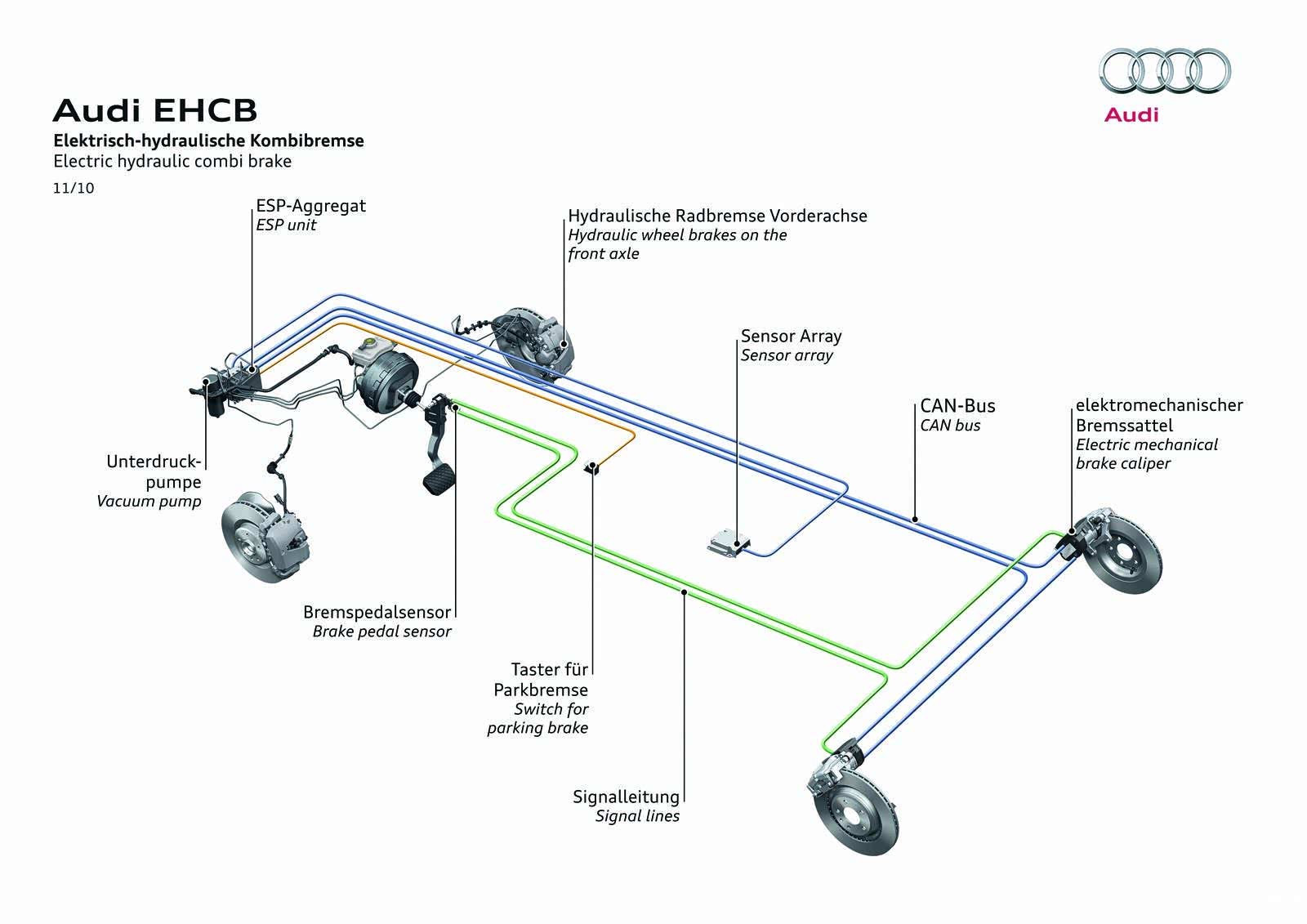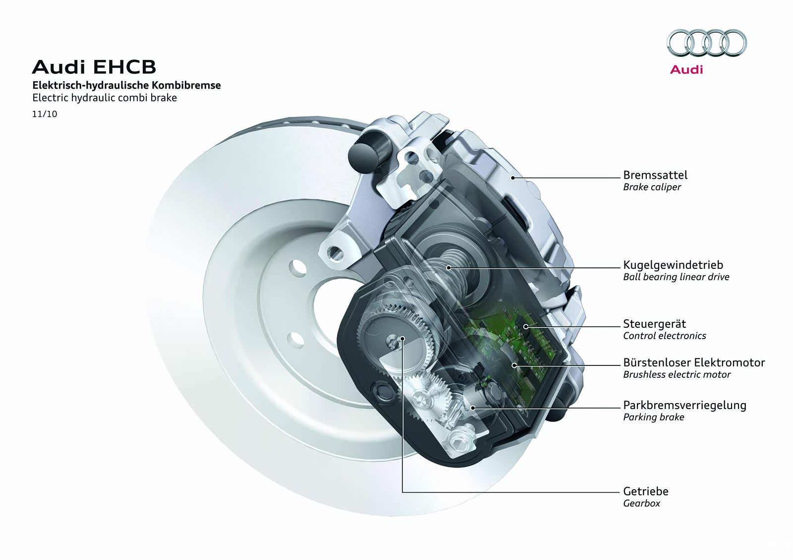 奥迪Q5混动版采用的EHCB电液控制刹车系统由电子真空泵、ESP刹车电子稳定系统单元、刹车踏板、前轴液压碟刹、电子手刹开关、传感器阵列、CAN通讯总线和机电刹车卡钳组成。
