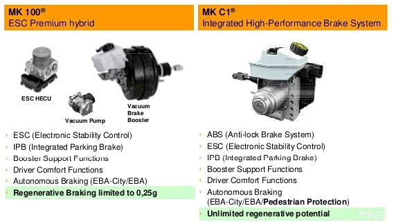 而另一大解决方案就是如下图所示来自德国大陆汽车Continental的MK C1系统。可以看到MK C1的主要理念和博世 iBooster基本相同。但是MK C1更进一步将原来的ESC刹车电子稳定系统MK 100中的ESC控制器、真空泵、真空助力器三个部件合而为一。大大简化了系统的复杂程度。