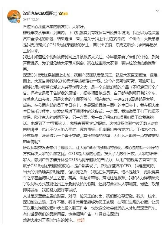 5月17日,深蓝汽车CEO邓承浩发文回应:“很多项目组成员,自己都特别想开着深蓝G318无忧穿越版,带着家人出去浪。只是大家的年假不够长,想完整地走一遍G318国道都是奢望,也是突发奇想讲了视频中的这段话。”