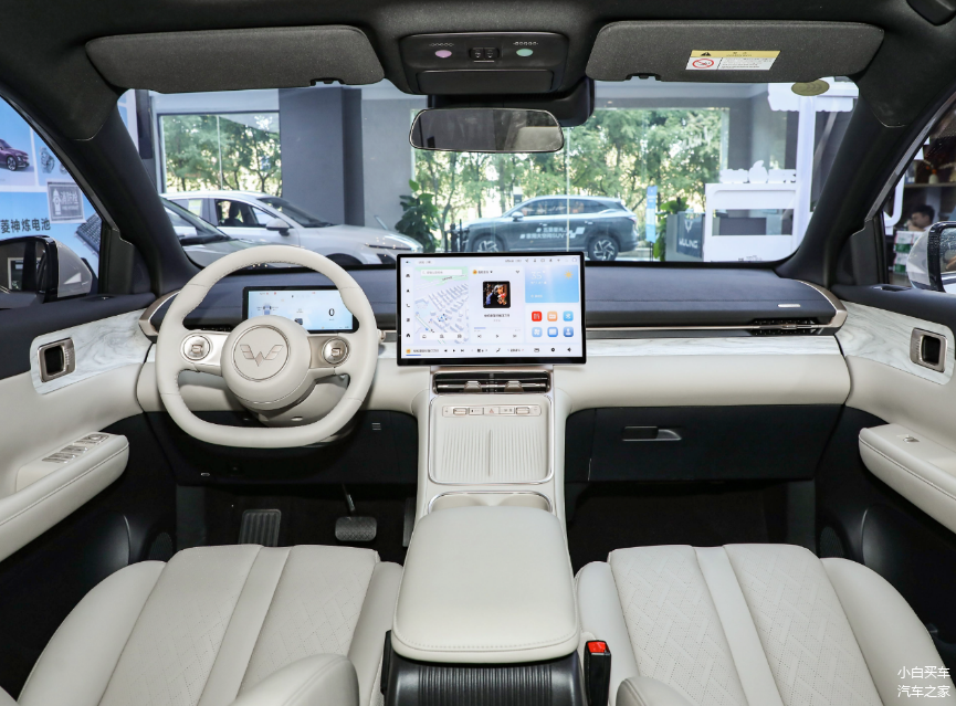 内饰设计非常简约,是目前主流的设计风格,不过在细节方面还能看到一些类似金色的装饰件以及仿木纹面板,五菱还是尝试在这方面营造一些高级感。多媒体方面搭载15.6英寸的中控屏,内置LINK OS智能车机系统,连续语音控制等功能也都是支持的。驾驶辅助方面则比较平庸一些,低配车型甚至只有定速巡航。