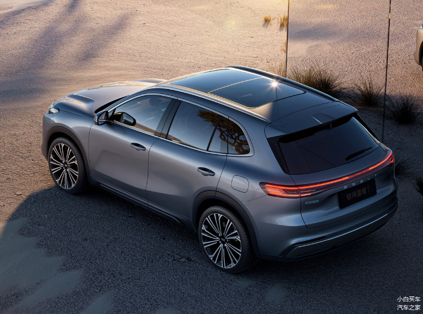 外形部分延续了吉利家族SUV的轮廓,但是前脸部分用到在新能源车上比较流行的贯穿式灯带以及封闭式中网设计,表明了这台车的身份。实际从侧面来看,星舰7 EM-i的体量感还是不小的,在紧凑型SUV里面,也可以算是比较大气的一款。