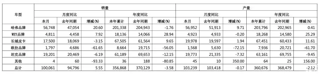 根据长城汽车公布的数据,1~4月其累计批发销量356868辆,同比下滑3.58%;其中新能源汽车销量为91371辆,同比增长11.95%。单看4月,长城汽车总销量为10万台,同比增长5.55%;不过具体到品牌,只有哈弗品牌实现了两位数的增长,4月销量为56748辆,同比增长20.60%;欧拉品牌同比暴跌61.65%,销量仅1797辆,1-4月累计销量8664辆,同比暴跌56.05%。