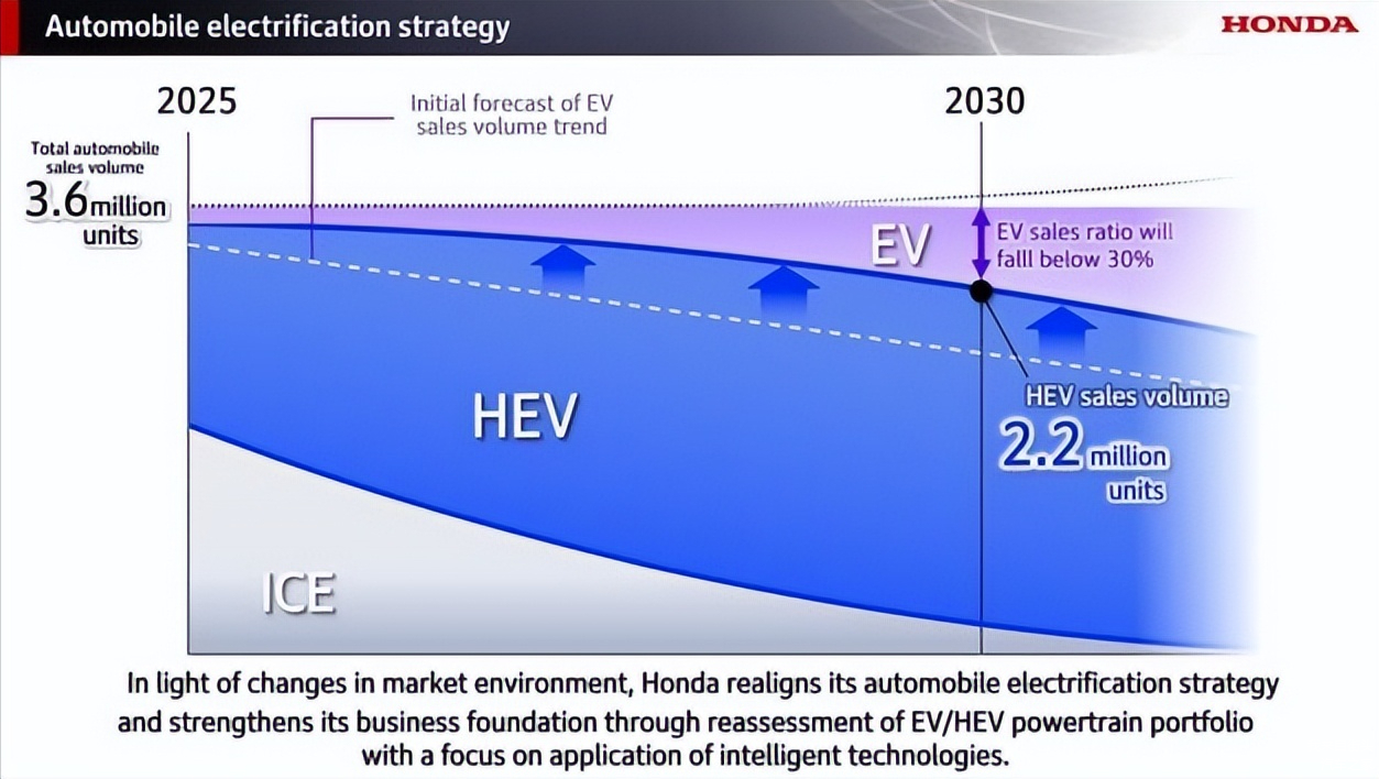 除了减少针对纯电动车的投资项目与数额外,本田也宣布将会重新调整关于纯电动车的销售目标计划,将原本计划在2030年达成30%销量来自纯电动车的目标下修为20%,并指这主要是基于多个国家的地缘政治、有所放宽的政府政策等因素。