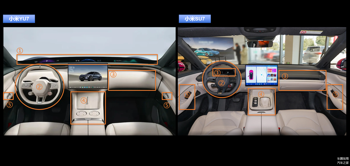 小米YU7采用全新的设计风格,整体氛围更具豪华感和科技感,与小米SU7相比主要变化点:①取消翻转仪表和HUD,新增P-HUD 「小米天际屏」②全新的方向盘样式,与小米SU7 Ultra相似③取消多层仪表台设计,副驾仪表台更简洁④中岛区域重新设计,与仪表台结合更紧密,取消物理按键⑤车门重新设计,新开造型