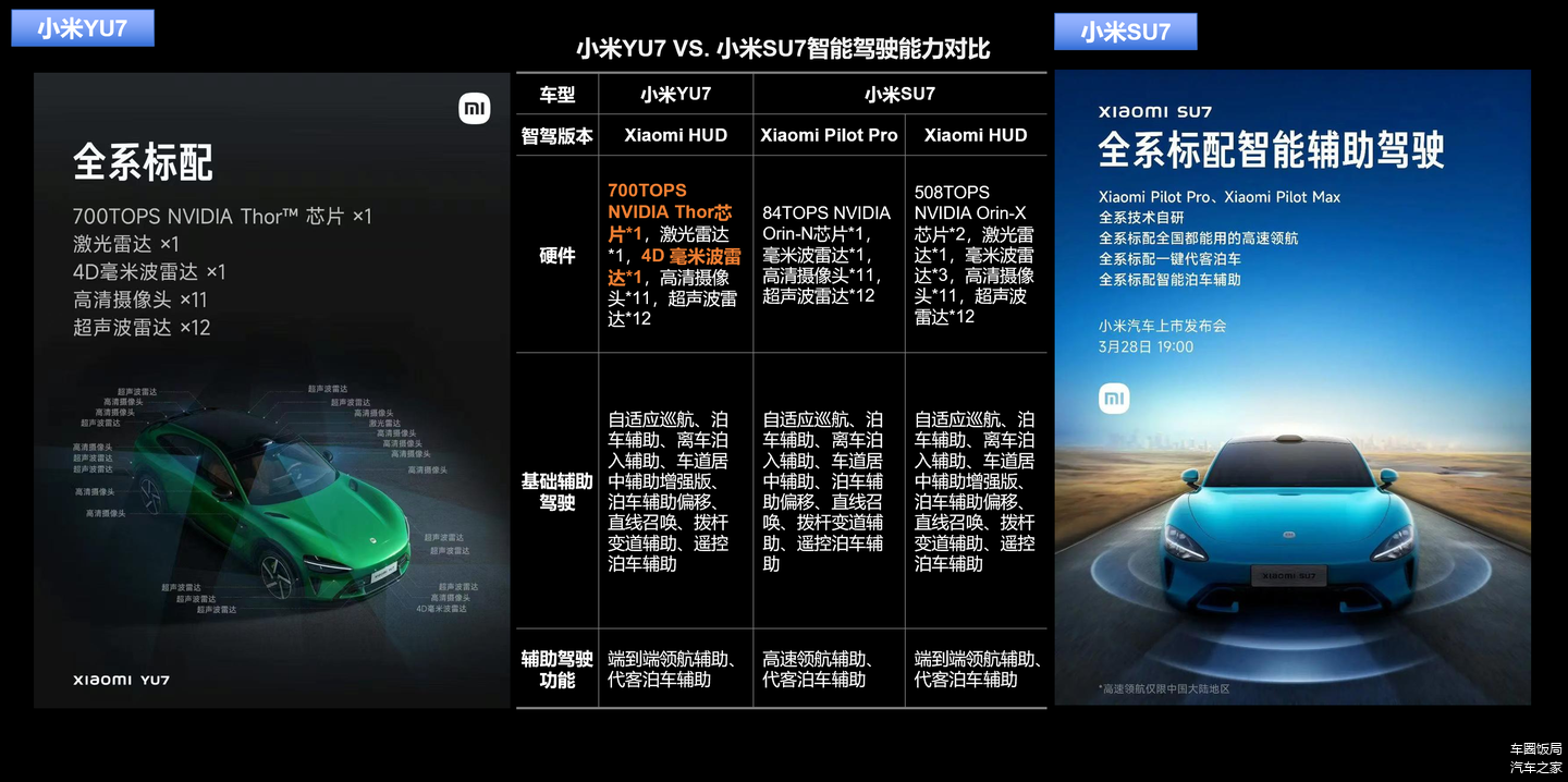 小米YU7全系标配激光雷达,搭载英伟达Thor芯片(算力700 TOPS)+1颗4D毫米波雷达+11个摄像头+12个超声波雷达,提升雨雾天气穿透识别能力,可适应各种复杂环境,实现更安全的辅助驾驶。