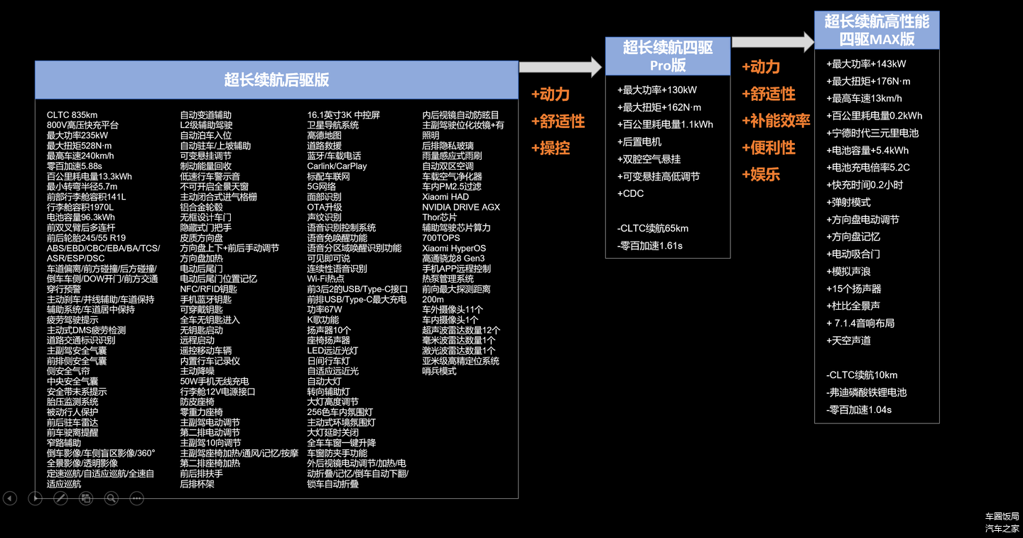 最后对比了小米YU7发布的三个版型,超长续航后驱版在智能化、乘坐舒适性上与其他两个版本一致,仅在动力、操控、舒适性、便利性、补能效率、娱乐配置上与MAX版本有差异,还是入门版最具性价比!
